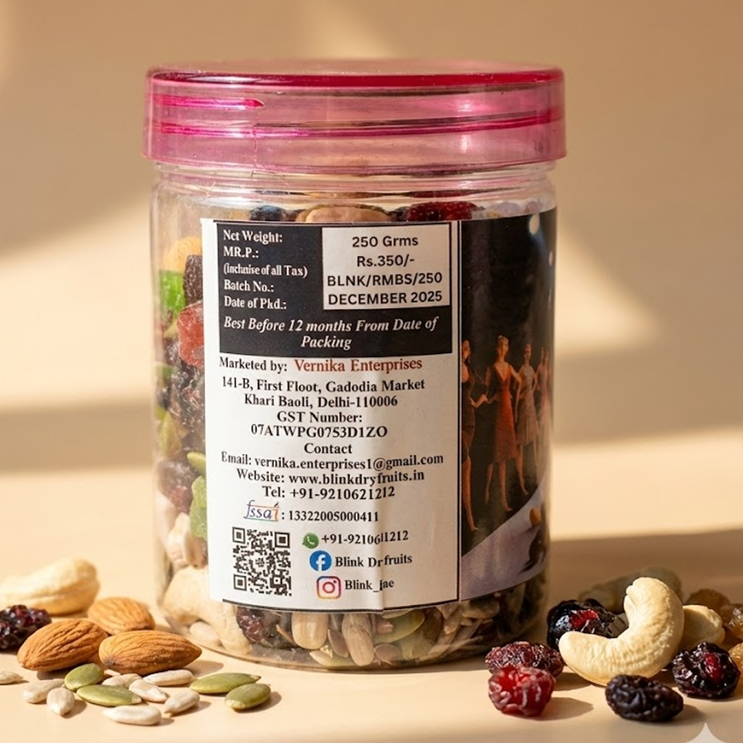 A deliciously balanced blend of roasted premium seeds and handpicked berries, crafted for those who love healthy snacking with a touch of natural sweetness. This mix delivers the perfect combination of crunch, chew, and nutrition ideal for fitness enthusiasts, busy professionals, and anyone looking for a wholesome snack option.